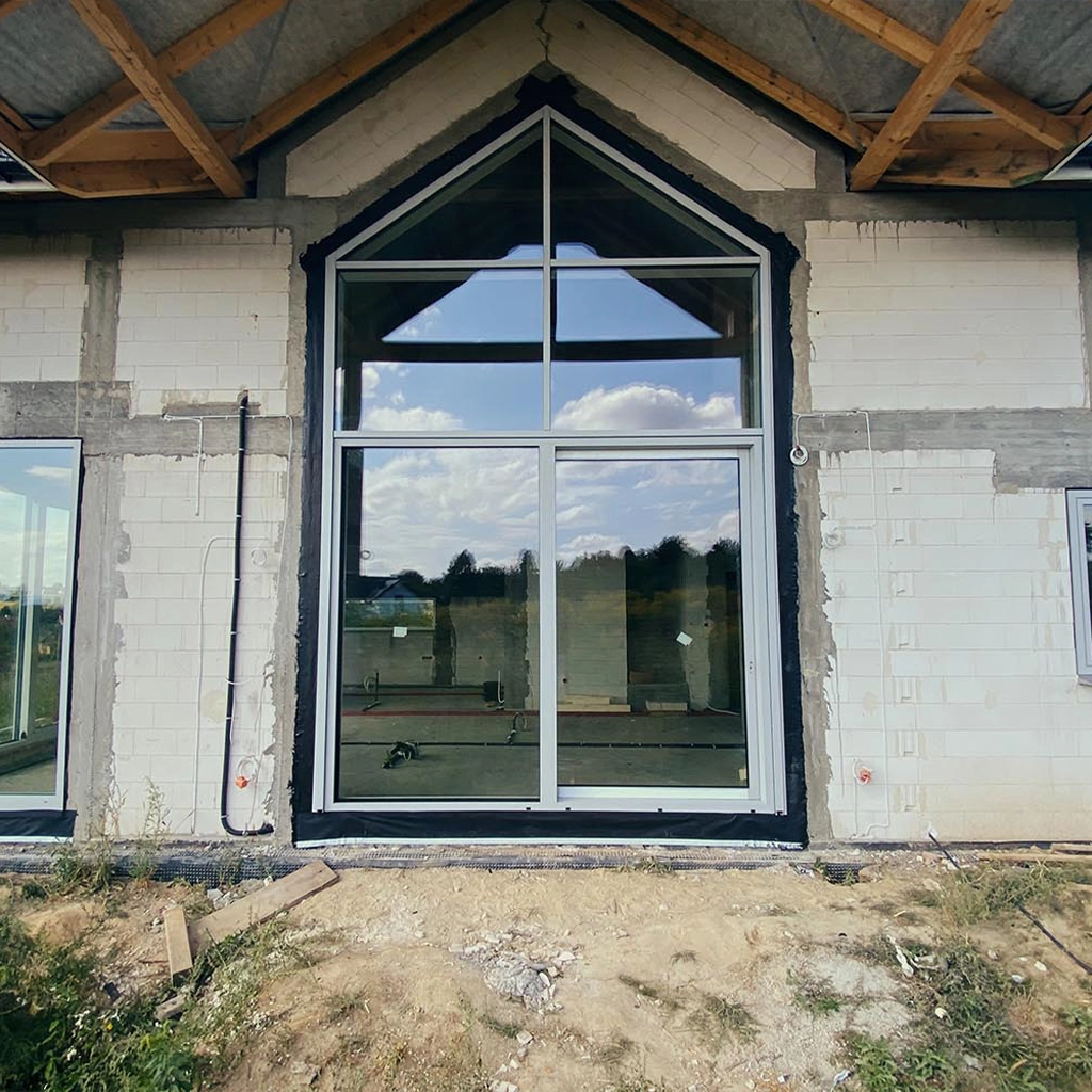 La conception de cette maison fonctionnelle au bord du lac, dotée d'un vitrage panoramique, fait appel à des systèmes de fenêtres en aluminium de pointe, qui garantissent une excellente durabilité et un design moderne. Les systèmes utilisés sont Aluprof MB-86 SI et MB-77 HS, connus pour leur exceptionnelle isolation thermique et acoustique.
